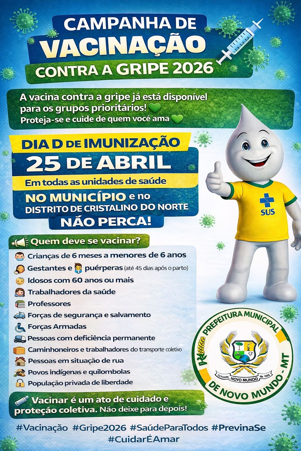 No último sábado, dia 25 de abril, a Prefeitura de Nobres, por meio da Secretaria Municipal de Saúde, promoveu o Dia D de vacinação contra a Influenza (gripe) em todas as unidades de saúde da zona urbana do município. A mobilização teve como objetivo ampliar a cobertura vacinal e reforçar a proteção da população, especialmente dos grupos prioritários, contra complicações causadas pelo vírus.