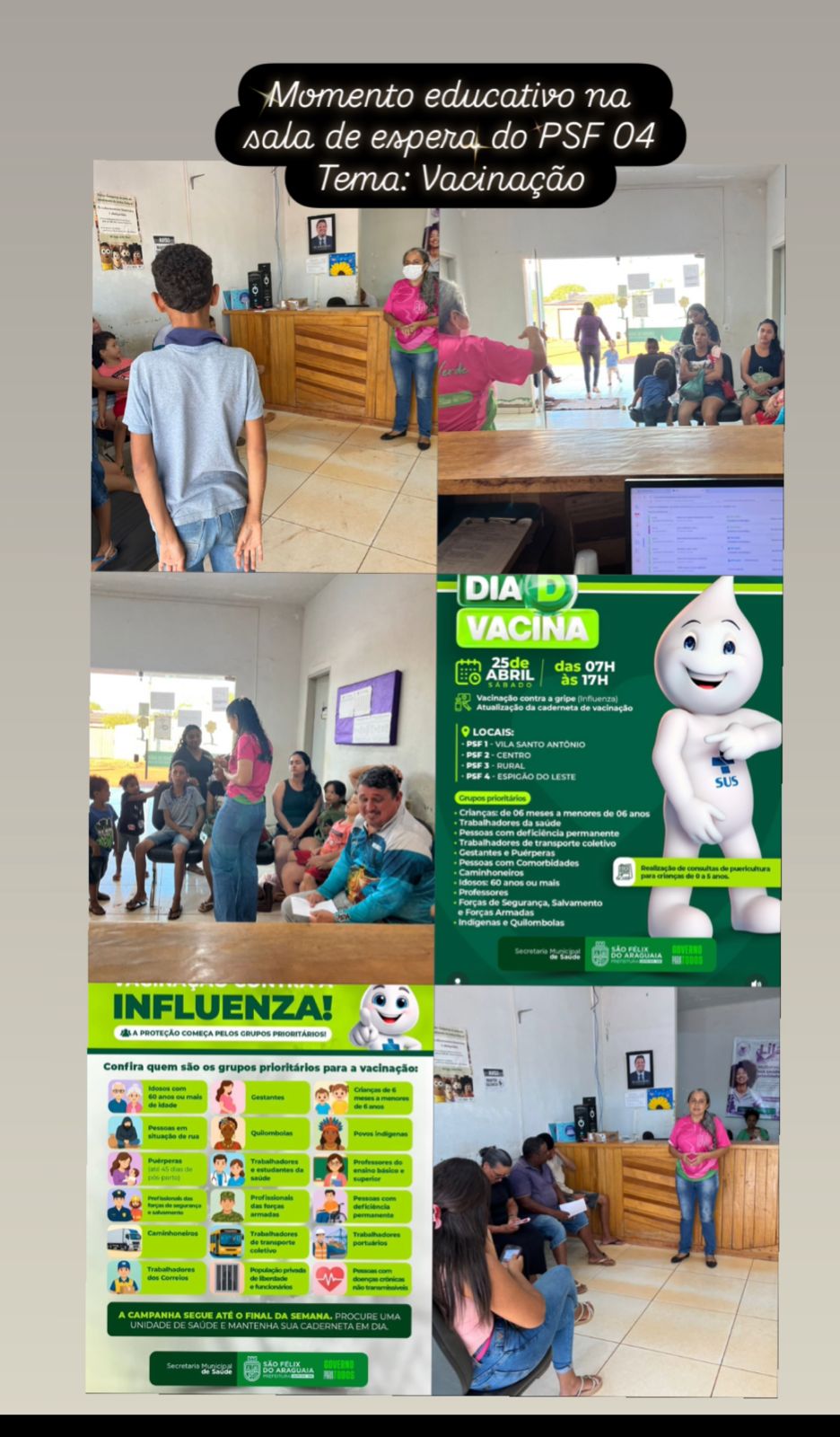 Momento de educação em saúde na sala de espera do PSF 04. No dia 22/04 a Técnica de enfermagem Ana Maria abordou o tema: Vacinação, sua importância na prevenção de doenças e agravos. Reforçando o DIA D DE VACINAÇÃO CONTRA A INFLUENZA que ocorrerá neste sábado, 25 de abril.
