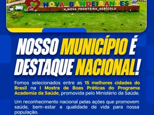 Nova Bandeirantes, localizada no extremo norte do estado de Mato Grosso, foi o único município do estado selecionado entre as melhores iniciativas do Brasil na I Mostra de Boas Práticas do Programa Academia da Saúde, promovida pelo Ministério da Saúde.