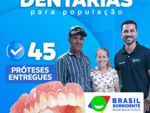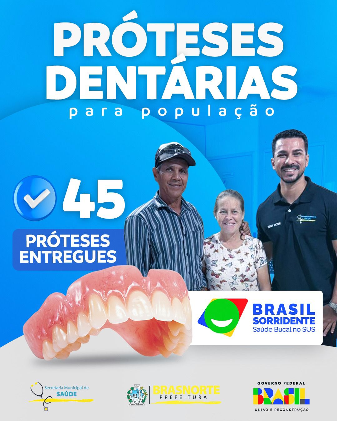 A Prefeitura de Brasnorte, por meio da Secretaria Municipal de Saúde, finalizou a entrega de 45 próteses dentárias à nossa população, garantindo mais dignidade, saúde bucal e qualidade de vida aos beneficiados. Essa ação faz parte do Programa Brasil Sorridente, do Governo Federal, executado pelo município de Brasnorte.
