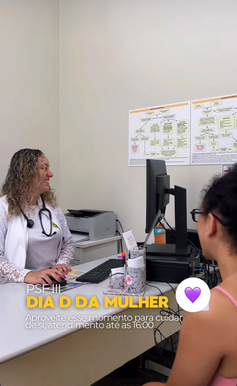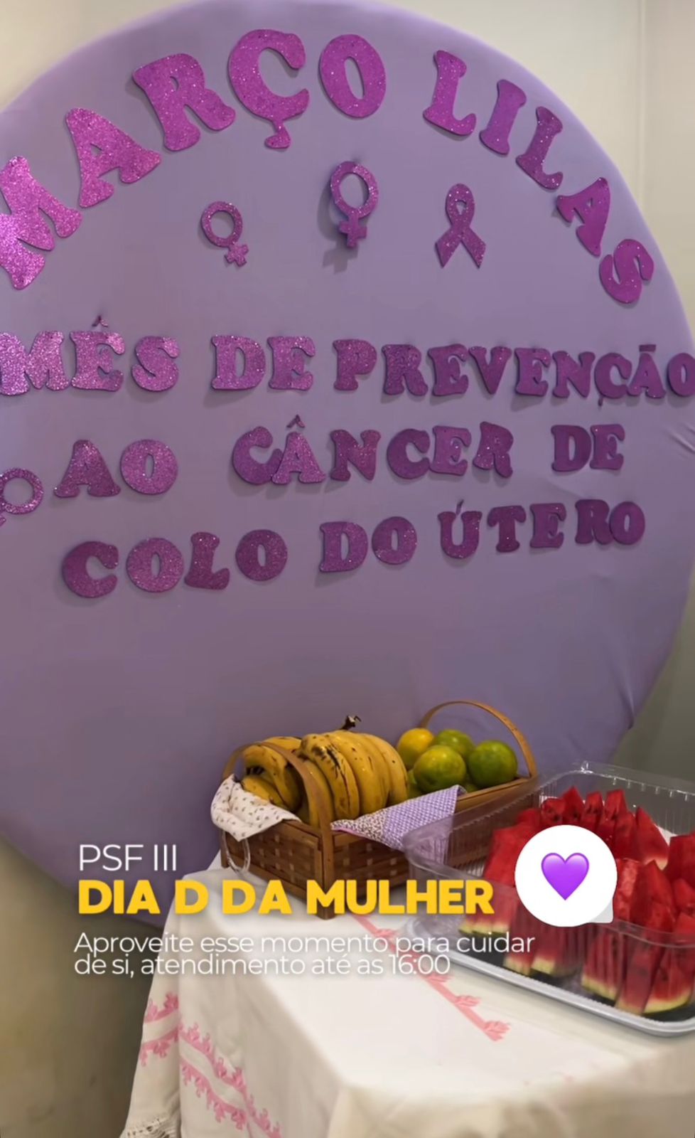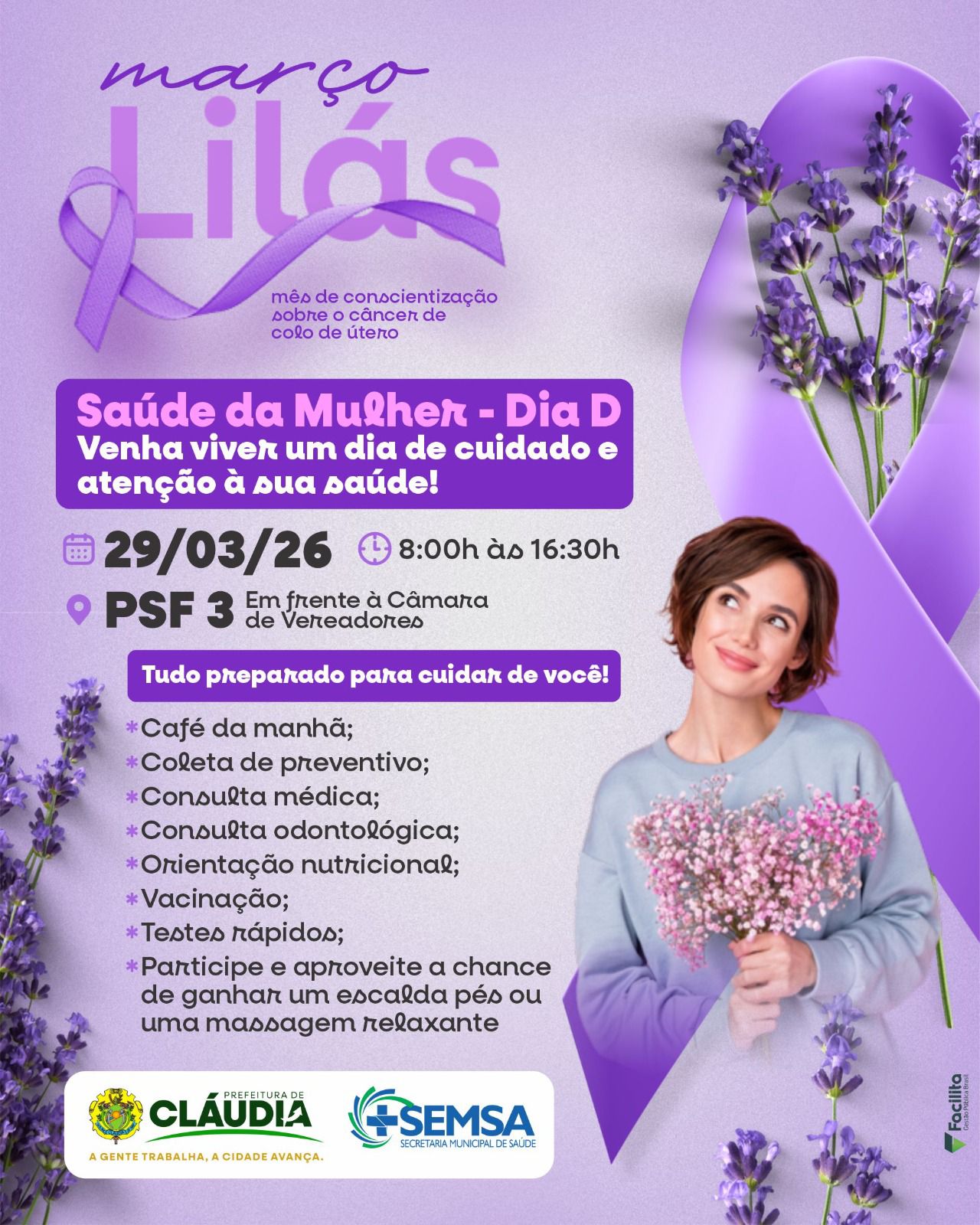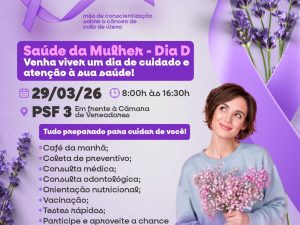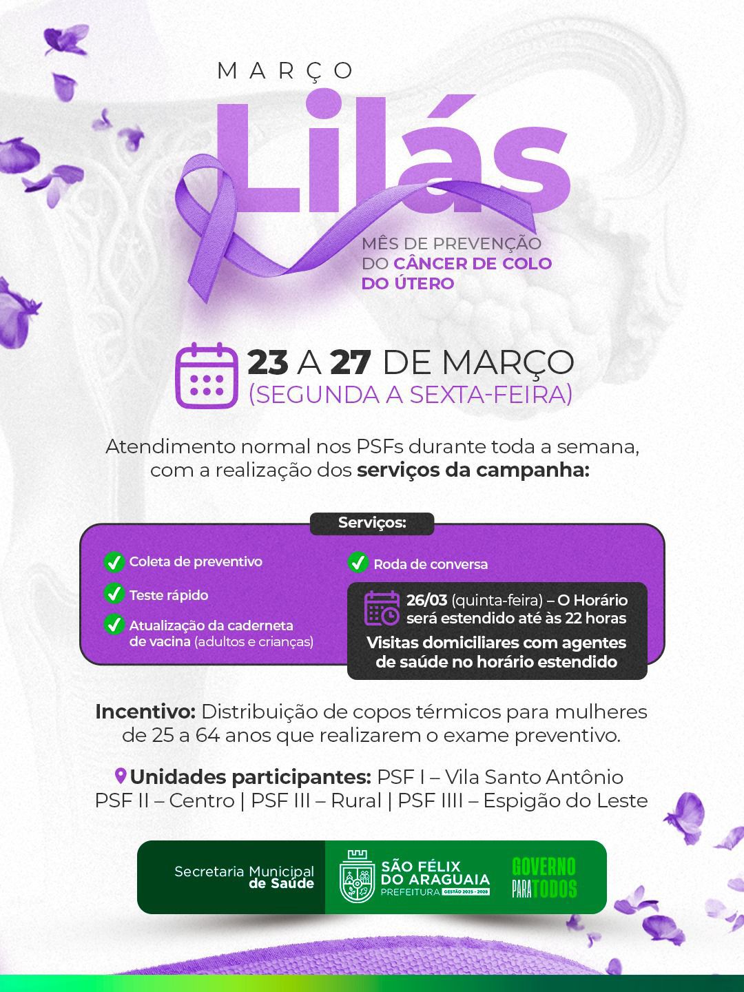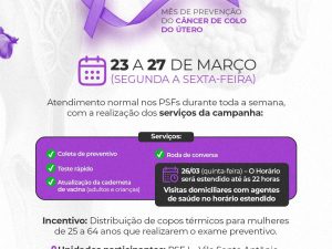 Março Lilás: cuidar da sua saúde é um ato de amor próprio. De 23 a 27 de março, os PSFs estarão com atendimento normal durante toda a semana, oferecendo serviços essenciais da campanha de prevenção ao câncer de colo do útero. Coleta de preventivo, Testes rápidos, Atualização da caderneta de vacinação, Rodas de conversa. Destaque: no dia 26/03 (quinta-feira), o atendimento será estendido até às 22h, com visitas domiciliares realizadas pelos agentes de saúde.