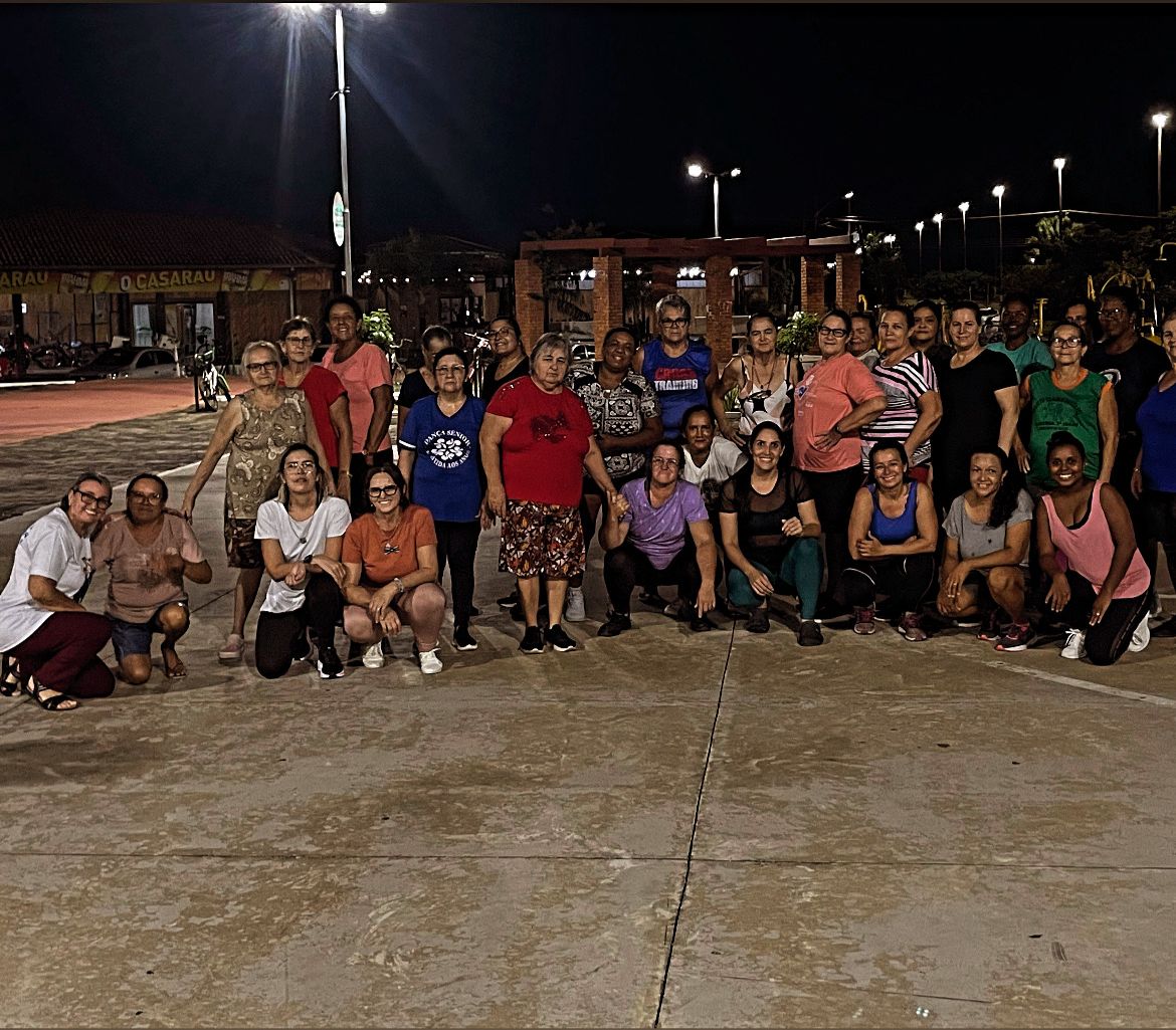 Grupo de mulheres fortes e determinadas participando semanalmente de ação em saúde com Educação Física, unindo movimento, bem-estar e treino funcional.