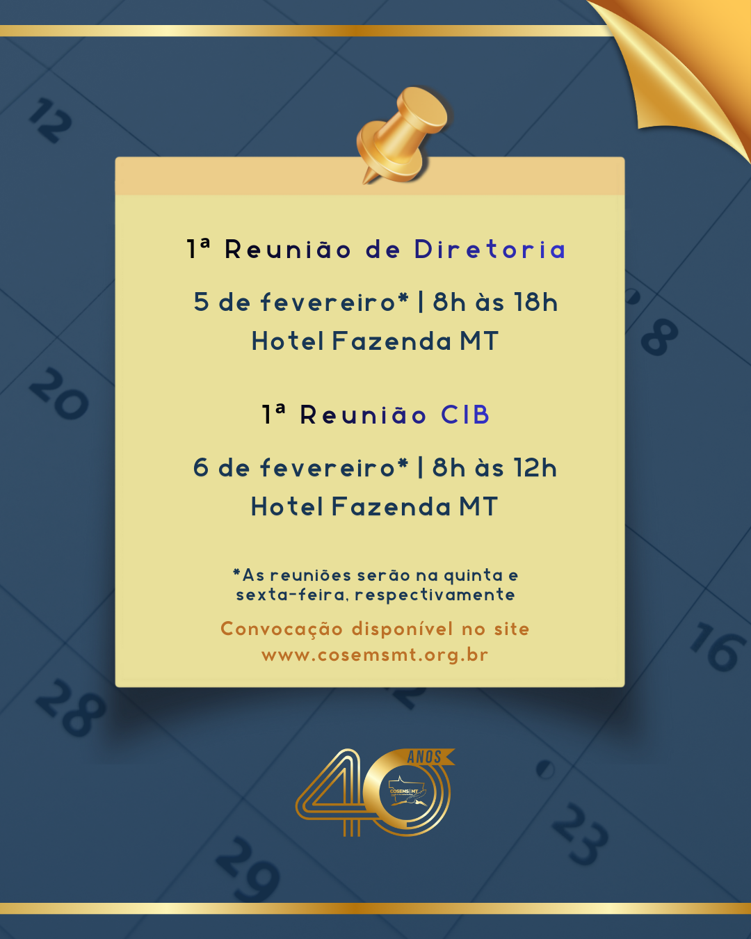 O Presidente do Conselho de Secretarias Municipais de Saúde de Mato Grosso (Cosems/MT) e o Secretário de Saúde de Nova Ubiratã, Marco Antonio Norberto Felipe, CONVOCA os Secretários(as) Municipais de Saúde, eleitos Diretoria Executiva, Conselho Deliberativo/Vice-presidentes Regionais e o Conselho Fiscal para 1ª Reunião de Diretoria a ser realizada no dia 05 de fevereiro (quinta-feira), das 8h às 18h, no Hotel Fazenda Mato Grosso (Cuiabá).