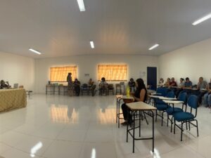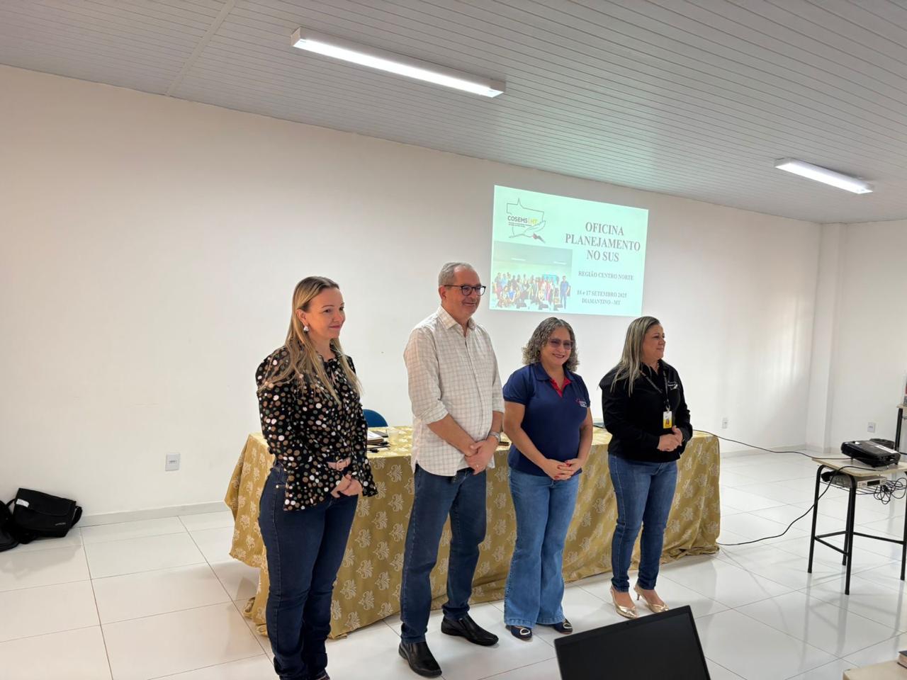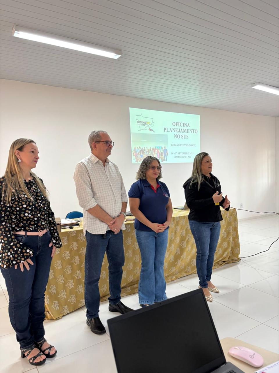 Nos dias 16 e 17 de setembro foi realizada a Oficina de Planejamento do SUS na Região Centro Norte, na Escola Técnica Seciteci em Diamantino. O evento contou com participação de 100% dos municípios da região, incluindo o Vice-regional Titular do Cosems/MT e Gestor de Nobres, Itamar Martins Bonfim, a Vice-regional Suplente e Gestora de São José do Rio Claro Regiane Marques Oliveira Silva, a Gestora de Alto Paraguai Vanessa Pereira Stocco e o Suplente Nilo Malaquias de Souza Neto, a Gestora de Nortelândia Thais Oliveira de Almeida e Suplente Juliana de Sousa Alves Oliveira, a Suplente de Diamantino Dilma da Conceição Araújo, a Suplente de Nova Maringá, Marilete Cristina Steffens, a Suplente de Nobres, Barbara Maria Barroso, a Diretora do Escritório Regional de Saúde de Diamantino, Sandra Regina Guimaraes, Presidentes dos Conselhos Municipais de Saúde dos municípios de Diamantino e Nobres, Universitários da Unemat Diamantino, técnicos e coordenadores da rede municipal e do ERS e a Apoiadora Lilian Rosa Tavares da Silva Bernardo.