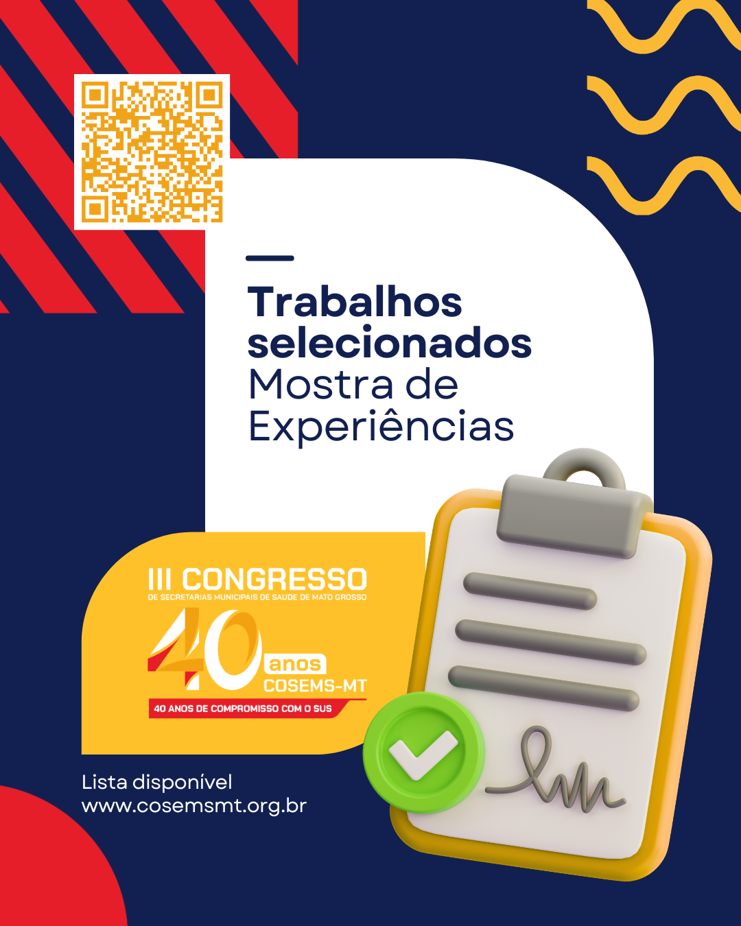 O Conselho de Secretarias Municipais de Saúde de Mato Grosso (COSEMS/MT) torna público os trabalhos selecionados para apresentação na “Mostra de Experiências Exitosas de Mato Grosso – edição 2026”, a ser realizada no 3º Congresso de Secretarias Municipais de Saúde de Mato Grosso, no período de 13 a 15 de maio de 2026, em Cuiabá/MT.
